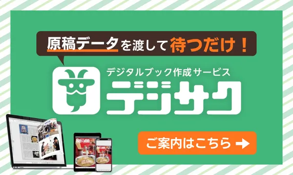 アクセス解析ができるデジタルブックは、デジサクで作成できます。デジサクのデジタルブックは、PDFを送付するたけで簡単に作成できるうえ、パソコンやスマホ、タブレットにも標準対応していて、どのような端末を使っているユーザーでも閲覧できます。